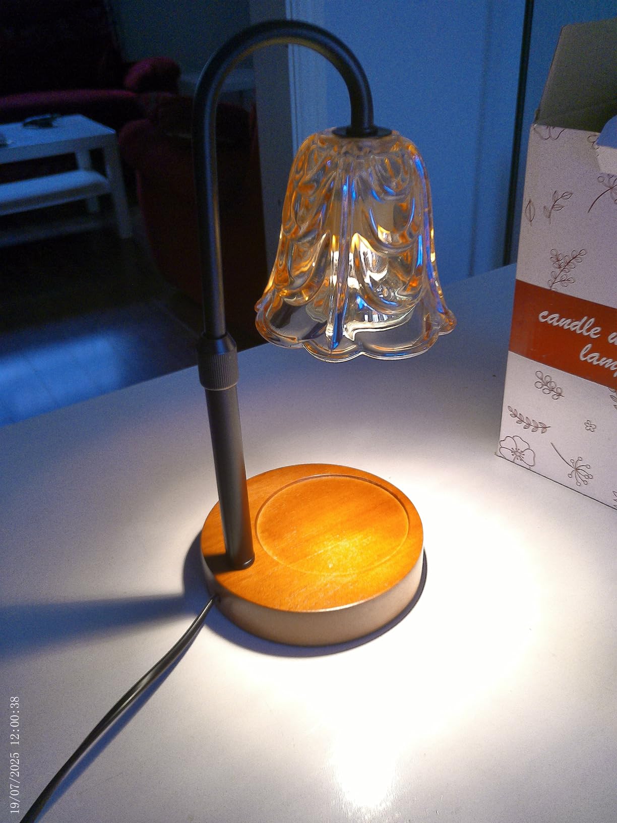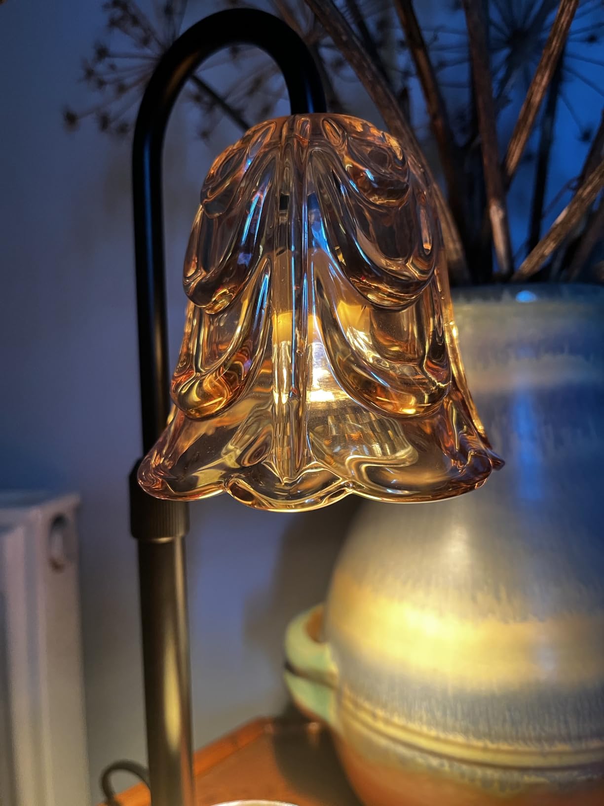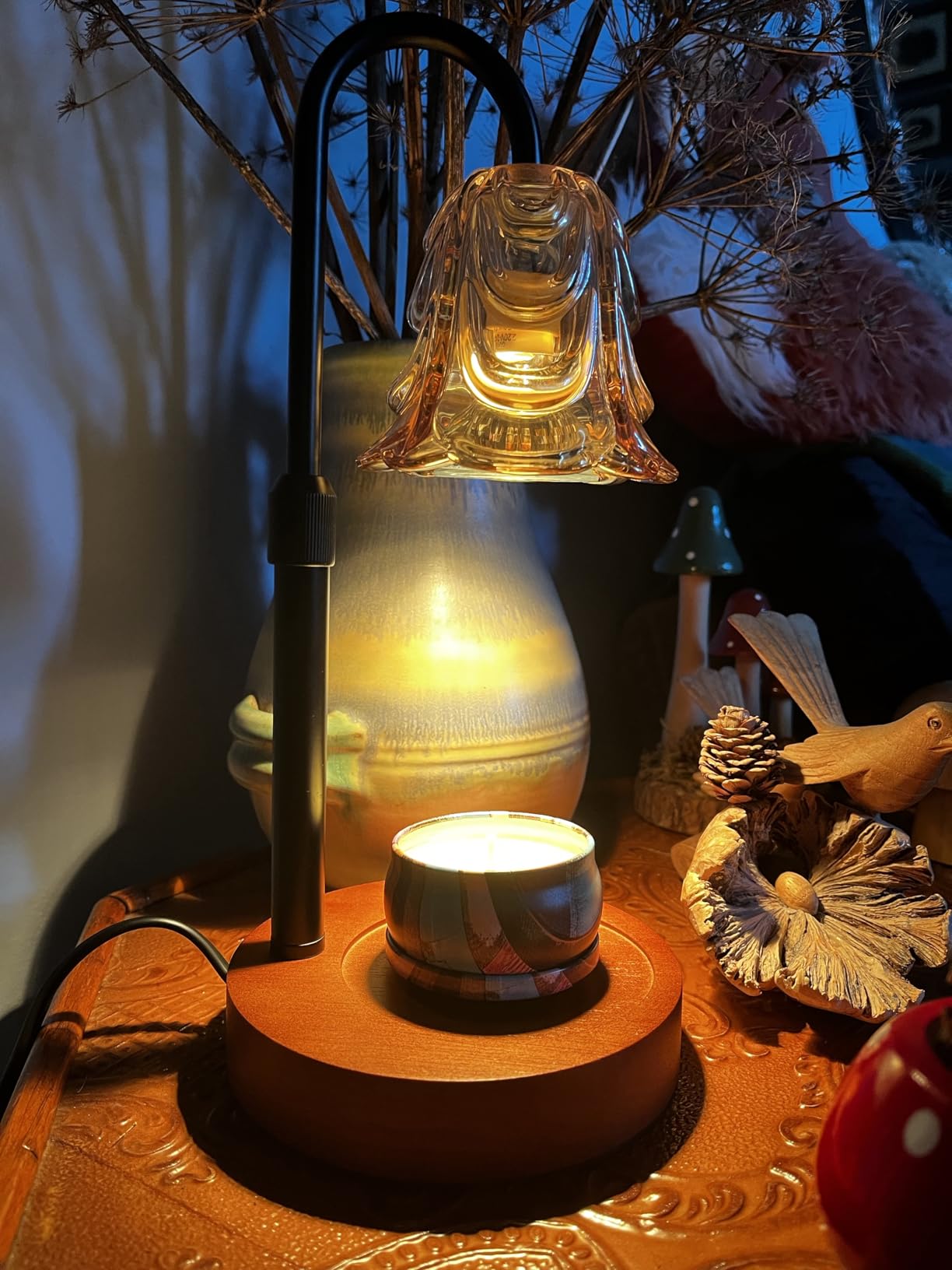 It uses a heat lamp to melt the wax from the top down—no flame. You get fragrance fast with a cozy glow from the lamp.